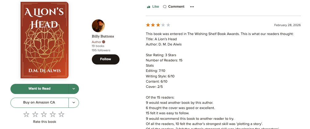 The Wishing Shelf Book Awards are based in the UK. They are, for the most part, as I understand, a not-for-profit. More importantly, they get the book in front of real, live readers. That means for a YA Fantasy, my book was given to 15 IRL teenagers, and their feedback was collected. More importantly, what I like most about this award is that it provides me with the feedback collected. They also give the authors the option to publish the results. I chose to have them publish their results despite the 3-star review.