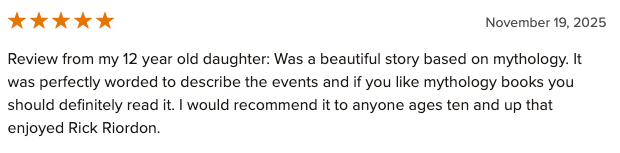 "It's not a very long novel, but that's okay. I liked the writing style. The beginning is slow, but the second half is better. If you enjoy myths and legends in school, this book is for you." Girl, aged 15