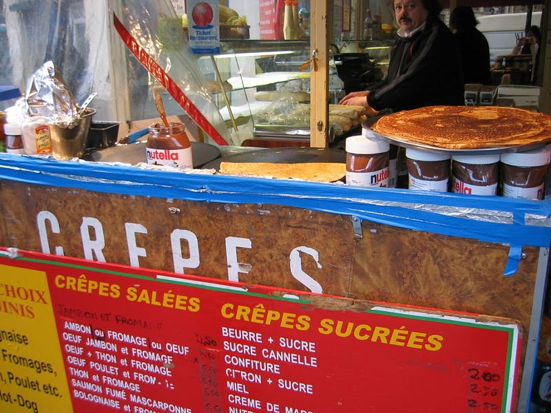 In France, you can have a savory crêpe served up with an assortment of fillers such as a “complete” featuring ham, cheese, and egg. For this you can shell out between 4 Euros at a market stall to 14 Euros at a crêperie. Then for dessert you can pay between 2.50 to 7 Euros for a sweet crêpe. Toppings to try other than the standard Nutella would be lemon and sugar or confiture (jam). Not knowing how to make the elevated crêpes, I resigned myself to the occasional treat.