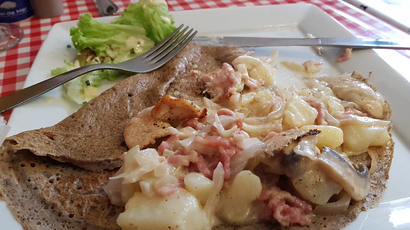 The savory crêpe or “Sarasin” is made mostly or wholly from Buckwheat flour, salt, and water. Variations can include milk, eggs, and all-purpose flour. To the uninitiated, making these crêpes can be disastrous as they often end up dry, crumbly or tasteless. The key is to combine the ingredients and to let it sit overnight until the buckwheat has absorbed the liquid. These are an ideal choice for vegans and the gluten intolerant. Buckwheat is not ‘wheat’.
